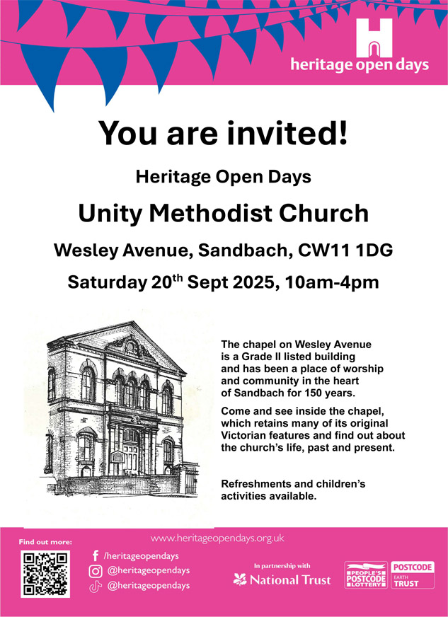 There will be an Open Day at the Unity Methodist Church in Wesley Avenue on Saturday 20th September as part of the Heritage Open Days scheme – more information on the poster below.